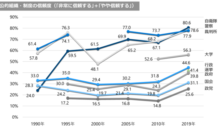 可以看出,日本人最信任的就是军队、警察和法院。大学的信任度就已经非常差了,而到了行政、选举、政府、国会,就简直是江河日下,至于政党,简直是快到了无人相信的程度。