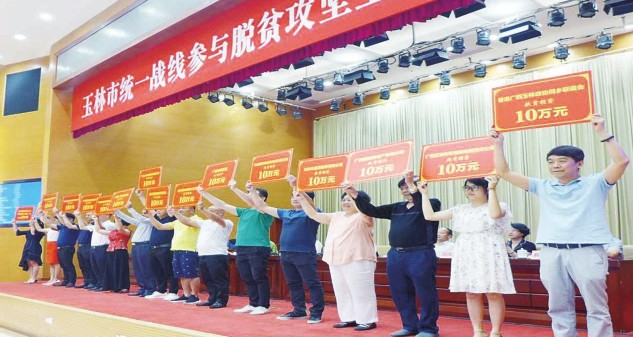 2019年5月24日,玉林市统一战线参与脱贫攻坚工作推进会召开。玉林市玉商总会领导班子成员积极响应,黄东代表广西威壮投资集团捐款200万元、常务副会长陈军代表广西云天实业集团有限公司捐款700万元、副会长陈庆祥代表广西祥龙房地产开发有限公司捐款67万元、副会长唐振代表广西参皇养殖集团有限公司捐款60万元、副会长梁有强代表广西玉林市广东温氏家禽有限公司捐款36万元……玉商们慷慨解囊,现场捐赠扶贫款共计2300多万元,充分彰显了民营企业的大爱。