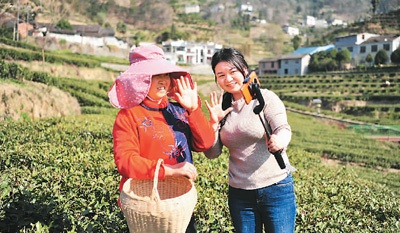 主播在湖北省宜昌市夷陵区太平溪镇早茶基地直播采摘春茶。