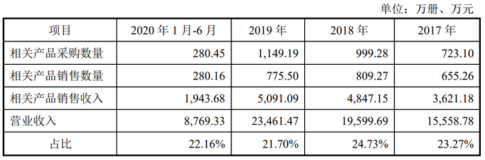 这一查华夏万卷发现,涉及的产品2017年至2020年上半年的营业收入分别达3621.18万元、4847.15万元、5091.09万元、1943.68万元,占总营业收入的比重分别为23.27%、24.73%、21.7%、22.16%。