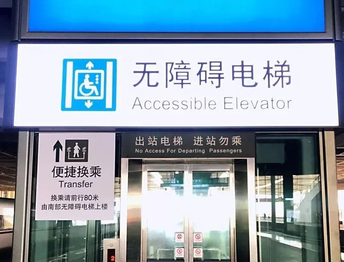 乘坐直达电梯的旅客一定要看清标识,分清换乘电梯和出站无障碍电梯。