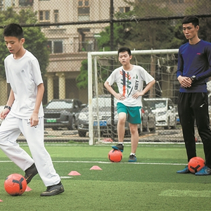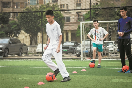 王均霖于去年9月报了课外足球培训班,如今他能娴熟地把足球控制在脚下,对中考足球项目拿高分信心满满。“王均霖刚来的时候颠球不是很流畅。”负责培训的谭教练表示,为了让学生掌握中考足球项目中最难的颠球技能,他除了教授颠球方法,如部位、支撑点和落点等外,还会布置颠球任务让学生多锻炼。