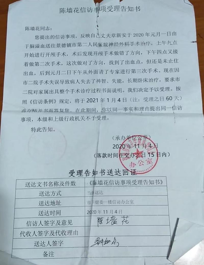 2020年11月4日,景德镇卫健委受理章新安妻子信访事项的告知书 。
