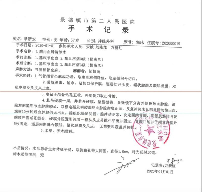 景德镇二医院的手术记录显示,当天参与章新安“左侧基底节出血血肿清除术”手术的人员包括主治医师刘隆茂、管床医生罗云华、规培医师陈壮和主任医师宋波。
