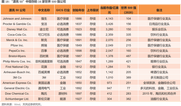 1、“漂亮50”分布:大消费有31家,工业6家,金融3家,能源3家,原材料2家。目前仍有42家存续(27家存续,15家重组后存续)。在27家上市主体存续的公司中,截止2020年底,平均市值接近1300亿美元,且有16家位列世界500强。