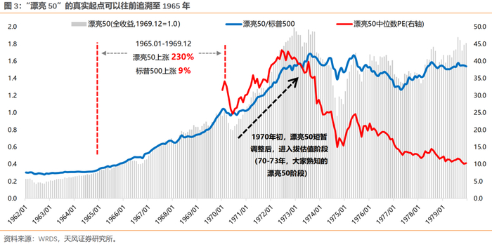 ① 股价下跌(1973.9-1974.9,12个月)、相对跑输(1973.9-1977.4,44个月)、估值下跌(1972.10-1980.3,90个月)。事实上,漂亮50行情可以从60年代算起,65-69年,漂亮50上涨 230%,标普500上涨 9%。