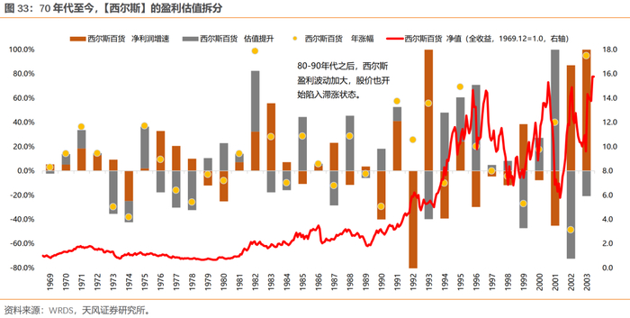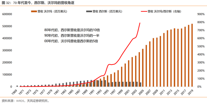 (3)西尔斯:背后反映的是美国百货业的百年“混战”,核心在于消费者结构、收入、需求等的变化。靠商业模式创新,或者消费需求随时代不断更迭的行业,永续增长能力较弱。80年代初,西尔斯营收是沃尔玛的10倍;90年代初,西尔斯营收是沃尔玛的一半;00年代初,沃尔玛营收是西尔斯的5倍。