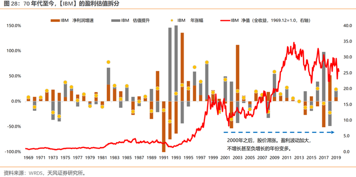 我们看到,IBM的涨幅也主要集中在80年代和90年代,分别上涨了+120%、+481%;而在00年代和10年代,仅上涨了+35%、+37%。