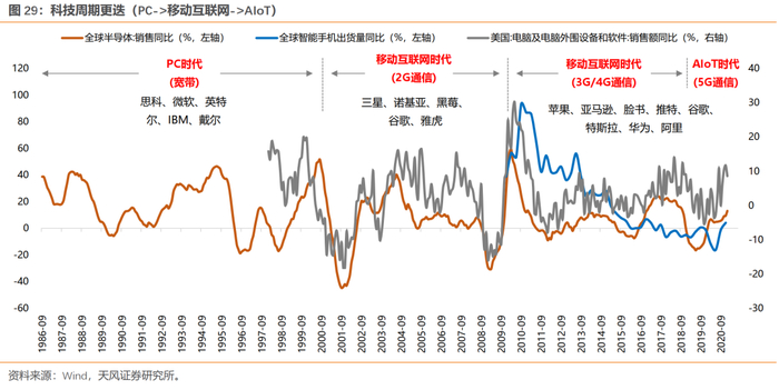 80年代以来,科技发展经历了PC时代,到移动互联网时代,再到人工智能物联网时代,而每个时代都孕育着从硬件设备、软件应用到商业模式创新,引领科技浪潮的公司,比如PC时代硬件端的IBM和思科,软件端的微软和甲骨文。