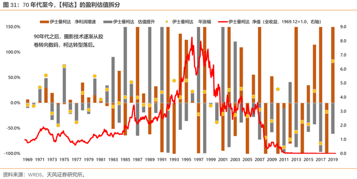 (2)柯达:柯达的倒闭凸显了科技技术路线变迁所带来的颠覆性变化。依赖于科技路线创新、产品不断升级换代的企业,其永续增长能力,要弱于必需消费品公司。