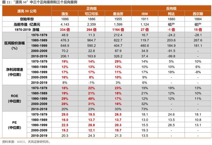 从事后观察角度,我们挑选“漂亮50”中三个正向案例和三个反向案例来做比较。三个正向案例:麦当劳、强生、可口可乐。三个反向案例:IBM、柯达、西尔斯。