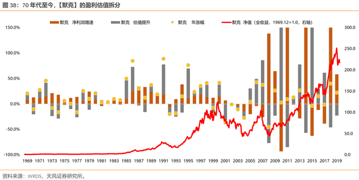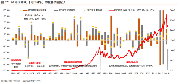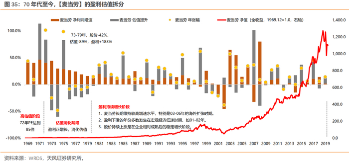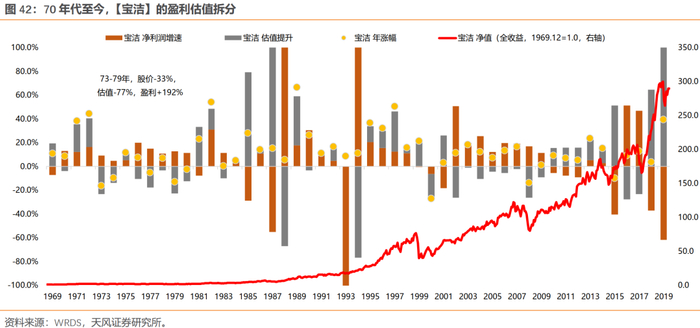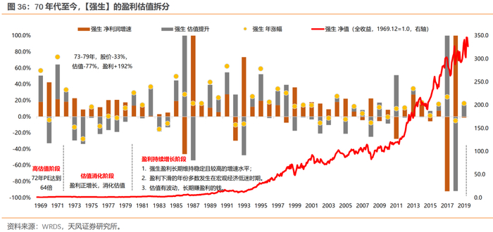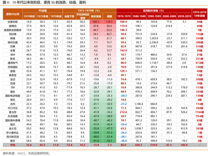 拉长整个70年代来看,除去1973-1974年有系统性风险的两年,其余年份,漂亮50主要靠盈利持续的高增长来消化估值。