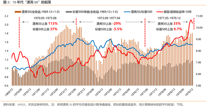 2、“漂亮50”起落:缘于经济持续增长和消费繁荣(分子驱动),阶段破灭于利率的大幅攀升(分母压制),而估值消化主要靠盈利的持续增长。