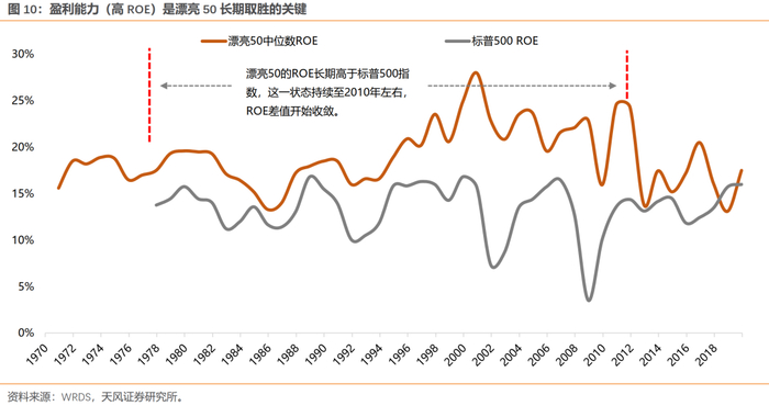 盈利能力(高ROE)是漂亮50长期取胜的关键。