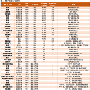 大消费有31家,工业6家,金融3家,能源3家,原材料2家。目前仍有42家存续(27家存续,15家重组后存续)。在27家主体存续的公司中,截止2020年底,平均市值1300亿美元,且有16家位列世界500强。