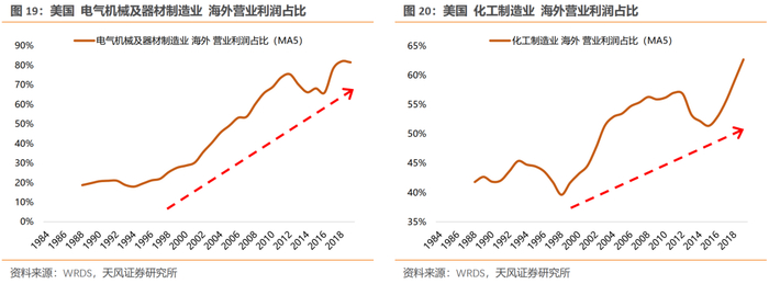 90年代以来,全球化扩张的步伐,是支撑美股各行业龙头盈利和股价再上台阶的关键。全球化扩张不只带来这些行业龙头公司新的成长空间,而且也驱使行业周期性弱化,甚至能获得盈利能力中枢的抬升。