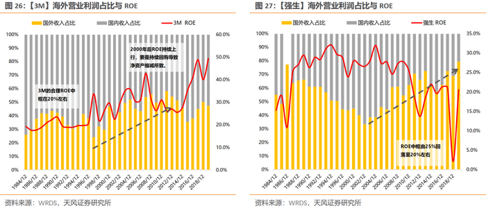 (3)第三级跨越:90S-00S全球化的扩张。90年代以来,全球化扩张的步伐,是支撑美股各行业龙头盈利和股价再上台阶的关键(各行业龙头ROE中枢都稳定在20%左右,不论是消费、科技,还是制造)。事实上到了2010年之后,部分公司开始第四级跨越,即通过持续回购来维持高ROE,比如麦当劳、3M。