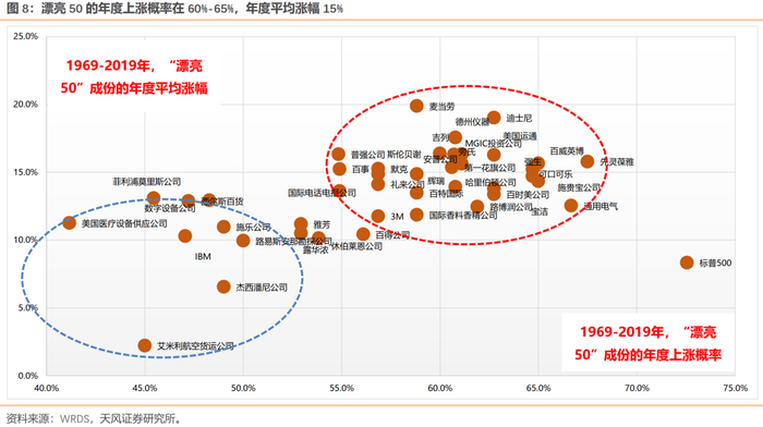 1969-2019年,漂亮50中,多数公司的年度上涨概率分布在60%-65%,年度平均涨幅在15%左右。事实上,绝大部分公司的年度上涨概率都小于标普500指数,但长期能够大幅跑赢标普500指数,主要是因为多数优质公司的涨幅弹性更大。