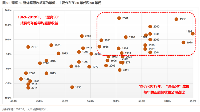 1969-2019年,漂亮50所有成份股中,每年的正超额收益占比较高,且平均超额收益也高的年份(下图中右上角部分),较多分布在80年代、90年代、00年代初期,当时对应的正是内外繁荣的宏观背景环境。