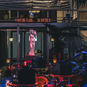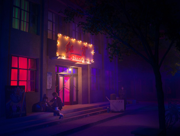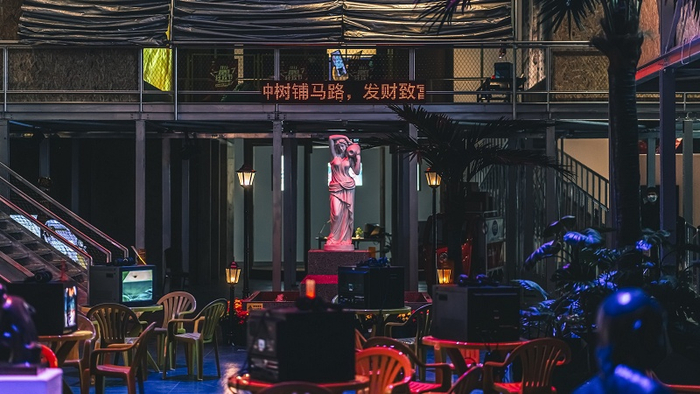 在北京UCCA的个展现场,一如《曹斐:时代舞台》之名,参观者似乎登上舞台,进入一个奇妙的时空隧道。你可以在上世纪90年代的南方街头大排档坐下,听着歌舞厅的喧嚣声,点一杯奶茶,吃上一份叉烧包;或是走到多媒体作品《人类几乎》中,和蔡徐坤的多重影像来一个打卡自拍。“更像是一个乐园,观众可以游走到城市的某一个角落。” 曹斐说。