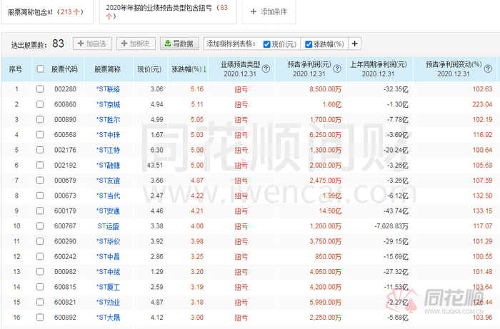 2021年以来,A股市场风格突变,以白酒、光伏等为首的抱团趋势板块持续调整,碳中和、超跌反弹、次新股、高送转等题材炒作受到资金热捧,一些存在摘帽预期、价位较低的ST股,也由此进入了部分投资者的视野。据同花顺问财数据显示,截至目前,ST板块中83只个股预期2020年年报将扭亏为盈。