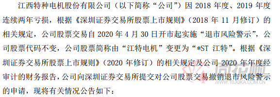 昨日晚间,*ST江特发布公告称,公司2020三季报归母净利润为2138.59万元,同比增长229.99%;营业收入为14.03亿元,同比下降-33.05%;根据《深圳证券交易所股票上市规则》(2020年修订)的相关规定,公司向深圳证券交易所提交对公司股票交易撤销退市风险警示的申请。