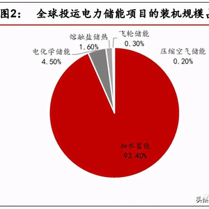 截止至 2019 年底,我国已投运储能项目累计装机规模 32.3GW,占全球 18%, 同比增长 3.2%。其中抽水蓄能累计装机占比最大,为 93.7%,比去年同期下 降 2.1 个百分点。