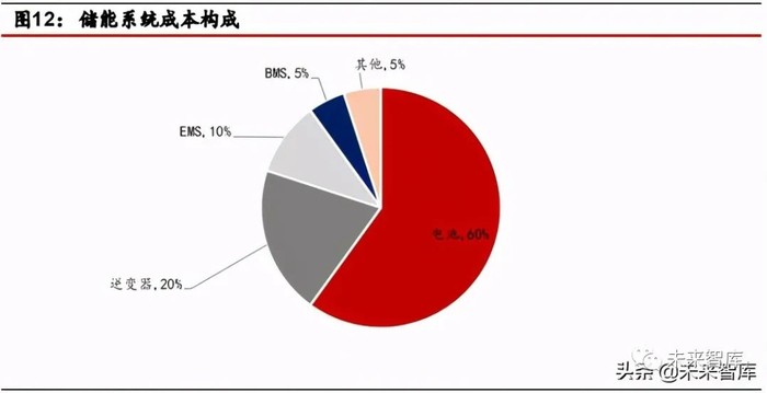 储能系统的成本构成中,电池是储能系统最重要的组成部分,成本占比60%;其次是储能逆变器,占比 20%,EMS(能量管理系统)成本占比 10%, BMS(电池管理系统)成本占比 5%,其他为 5%。
