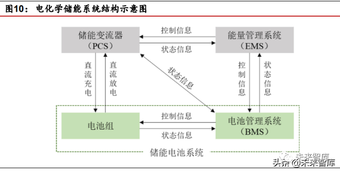 完整的电化学储能系统主要由电池组、电池管理系统(BMS)、能量管理系统 (EMS)、储能变流器(PCS)以及其他电气设备构成。电池组是储能系统最 主要的构成部分;电池管理系统主要负责电池的监测、评估、保护以及均衡 等;能量管理系统负责数据采集、网络监控和能量调度等;储能变流器可以 控制储能电池组的充电和放电过程,进行交直流的变换。