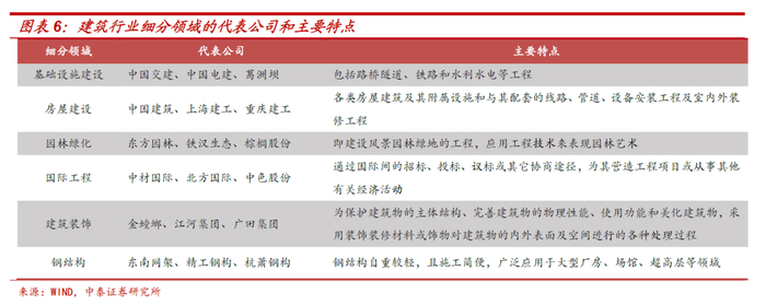 建筑行业的细分领域大致包括基础设施建设、房屋建设、园林绿化、国际工程、建筑装饰和钢结构。主要特点和代表公司如下表所示: