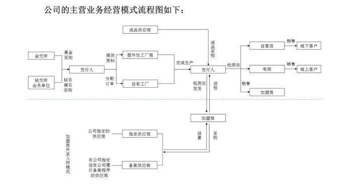 根据招股书中信息,贝壳财经记者梳理了周六福的大致经营流程。周六福从金交所或钻交所会员单位采购黄金或钻石裸石后,通过委托加工商和自有工厂完成生产。继而进入流通环节,这些成品中一部分流向自营店或网店,另一部分则流向加盟商。