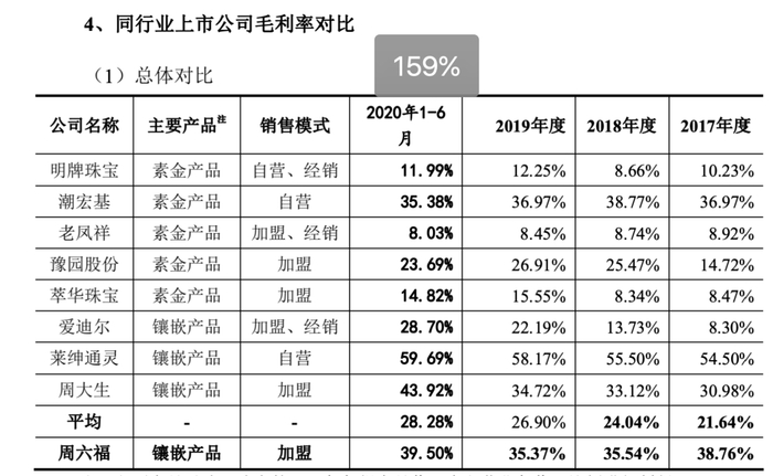招股书显示,2020年上半年,周六福的销售毛利率高达39.5%,与同行业上市公司相比,不仅超过老凤祥、豫园股份、潮宏基等老牌企业,过去数年同样一直超过28.28%的行业平均水平。