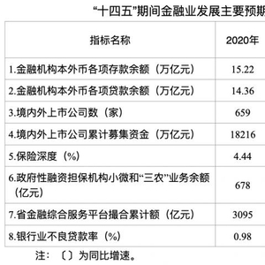 浙江地方金融监督管理局日前发布的《浙江省金融业发展“十四五”规划(征求意见稿)》(下称《规划》)提出了浙江省“十四五”金融业发展主要目标:到2025年,金融机构存、贷款分别超过22万亿元和21万亿元,直接融资占比进一步提高,保费深度超过5%;力争新增资本市场融资8000亿元;截至2025年末银行业不良率1.5%左右。