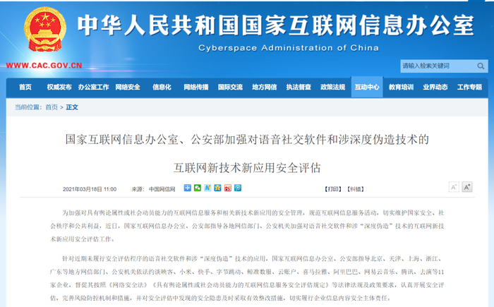 3月18日,网信办发布公告称,监管机构约谈了阿里巴巴、腾讯、小米、字节跳动等11家科技公司,原因是这些公司有语音社交软件或涉“深度伪造”技术的应用“近期未履行安全评估程序”。