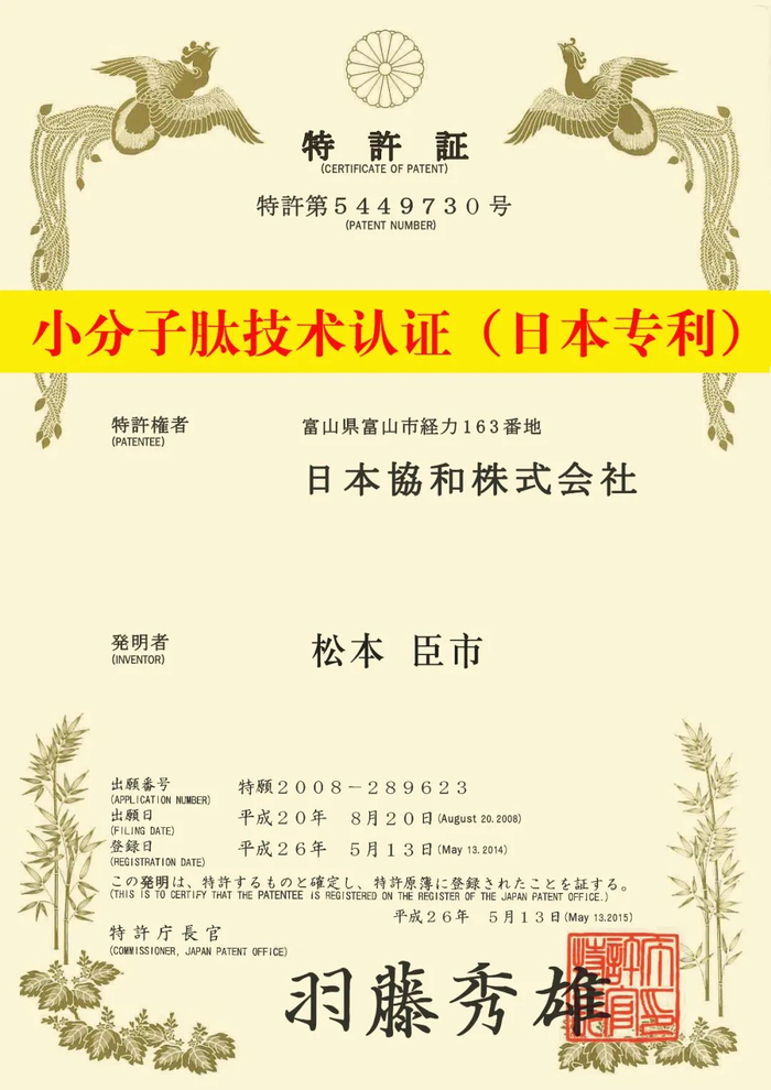 具有专利的小分子肽技术(证书号:5449730),则能让它快速被人体吸收。