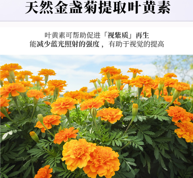 叶黄素素有「眼黄金」之称,这款越橘叶黄素片采用的叶黄素,是从天然植物金盏花中提取出来的。