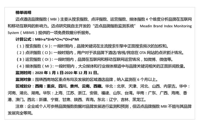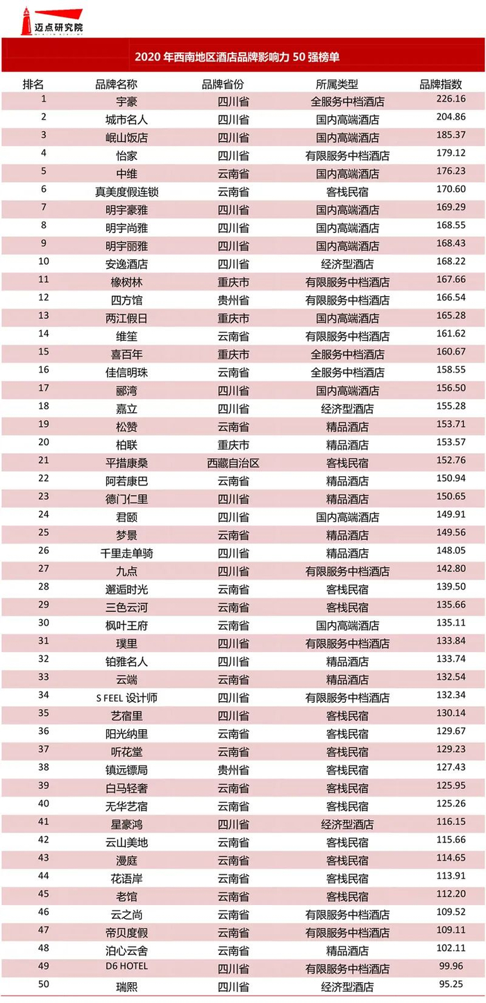 迈点研究院独家发布“2020年西南地区酒店品牌影响力50强榜单”,从潜在客群表现、媒体聚集、品牌运营表现、网络口碑四个方面综合解读西南地区酒店品牌在互联网及移动互联网领域的影响力,为品牌制定战略方案提升品牌发展赋能。