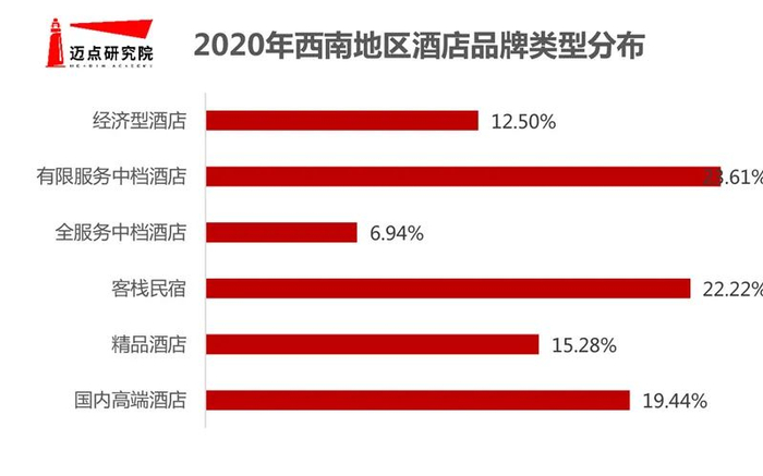 根据迈点研究院酒店品牌监测,西南地区酒店品牌数量来看,迈点研究院共监测1050个酒店品牌,西南区域性品牌有83个,占比为7.9%。其中高端酒店、中档酒店、经济连锁酒店、非标住宿分别占比19.45%、30.55%、12.50%、37.50%,与其他区域不同的是,西南地区经济连锁酒店较少,不足10%,非标住宿品牌占比较高,接近40%,中高档酒店品牌占比接近50%,西南地区酒店业发展速度和模式均较为快速稳健,品牌结构比例整体朝着更为成熟的方向发展。