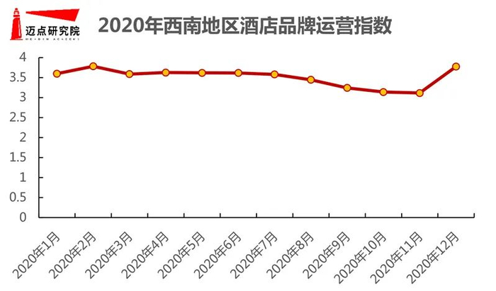 从西南地区酒店品牌指数变动来看,整体趋势维稳,与其他区域不同的是,2020年各月度指数波动疫情影响较小,2月份品牌指数下降,4-5月疫情稳定后,品牌指数加速回升,9月份达到小型峰值。从各指数维度表现来看,媒体指数、搜索指数峰值出现在11月,点评指数、运营指数峰值出现在12月。运营指数具体来看,受疫情影响整体呈现缓慢下降态势,但整体处于高值,伴随疫情常态化控制,12月达到顶峰。