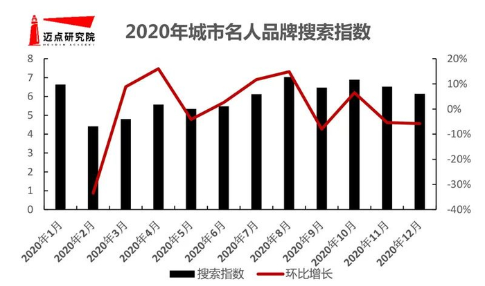 在潜在用户关注方面,城市名人平均搜索指数保持高位,2020年月平均搜索指数为5.95。2020年搜索指数整体呈现上升趋势,年初受疫情影响,2020年2月跌入谷底,在常态化疫情控制下,城市名人搜索指数逐渐回升。2020年城市名人在百度、搜狗、360趋势等主流搜索引擎搜索月均值为206.67,潜在客群整体关注度相对较高。