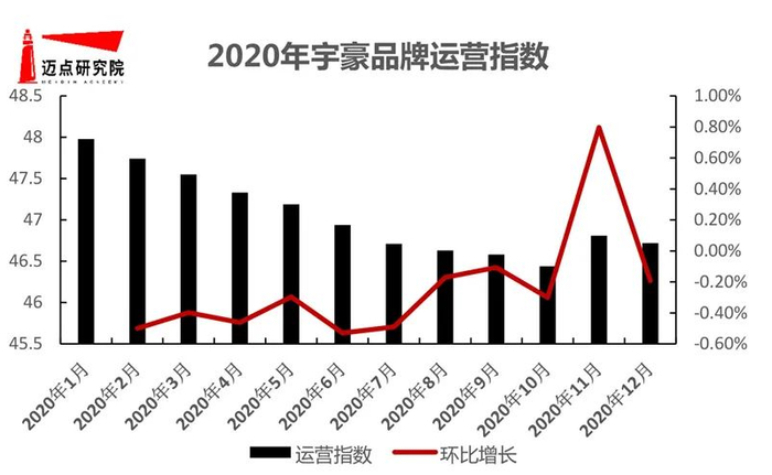 宇豪2020年月平均运营指数为47.05,位居西南地区酒店品牌运营指数第一位;从指数波动来看,运营指数在2020年1月达到高峰,此后几月呈现下降态势。据迈点研究院监测,2020年在微信、搜狗、微博文章数接1129条,其中微博累积发布量4355条,微博粉丝数为486180,微博内容包括服务技能大赛、特许经营管理签约、品牌获奖信息、直播销售、飞猪特卖、门店开业。