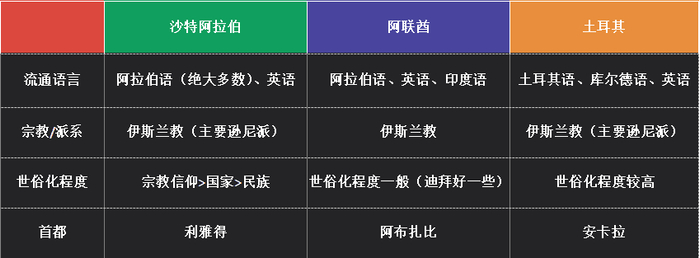 政治关系笔者就不多分析了,中东地区的混乱和宗教冲突、意识冲突、经济矛盾、内部抱团以及美国等第三方势力的干预,都有一定关系,三言两语确实理不清楚,但可以确定的是沙特、阿联酋和土耳其都是(近些年)没有战乱的和平国家,国内局势比较稳定(尤其是前两者)。
