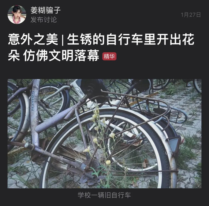 从生锈的自行车里开出花朵,作者仿佛看到了人类毁灭的废墟上,只剩下工业时代的残影,花朵既是文明落幕的献礼,又似乎在暗示希望的到来。