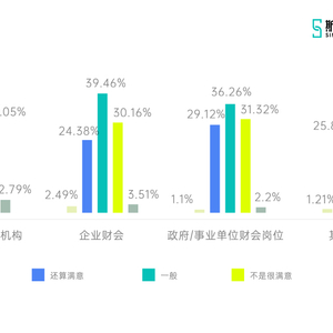 但同时,在针对从业者对现工作的满意度调查中,事务所等专业机构呈现出了最高的满意度,有35.75%的事务所从业者给出了偏满意的选择。而从事企业财会和政府/事业单位财会类岗位人群,以“不痛不痒”的中间选择为主。