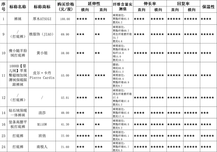 9款面料直向和横向伸长率表现较好的打底裤重量较轻,手感柔软,但只有3款保温性能达到五星标准。