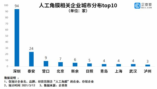 企查查数据显示,目前我国共有人工角膜相关企业209家,2020年全年新注册企业7家。从地区分布来看,深圳市以94家企业数量排名全国城市第一,占比全国总量的45%,泰安、营口分列二三位,广东、山东、江西则是排名前三的省份。