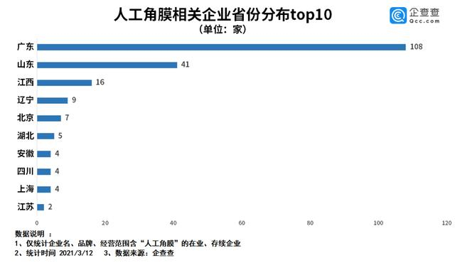 从省份分布来看,我国人工角膜相关企业数量最多的是广东、山东、江西等地区。其中,广东省目前以108家企业排名第一,山东省以41家排名第二。江西、辽宁、北京则分别以16家、9家和7家分列3-5名。