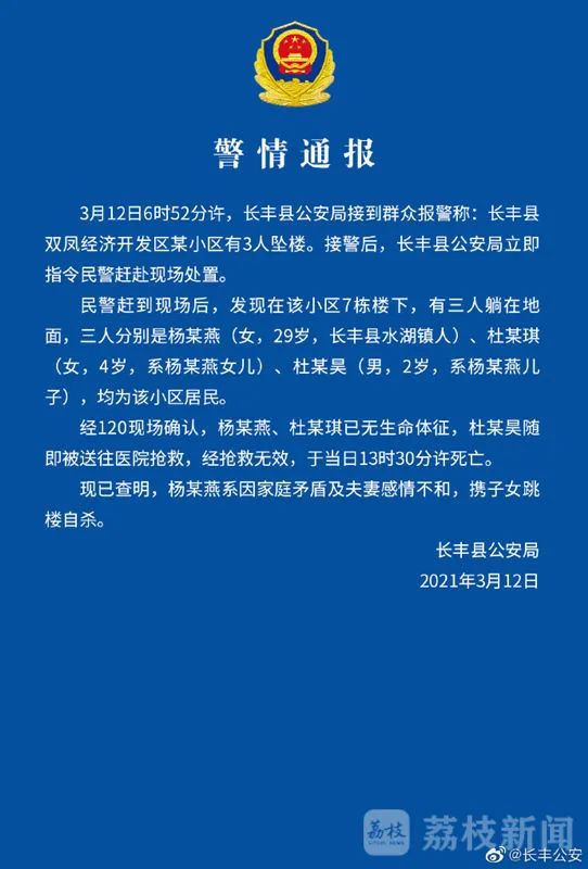 3月12日清晨,29岁的合肥女子杨某燕携子女纵身从24楼的家中跃下,其大女儿当场死亡,小儿子经抢救无效后离世。据警方通报,杨某燕系因家庭矛盾及夫妻感情不和,携子女跳楼自杀。