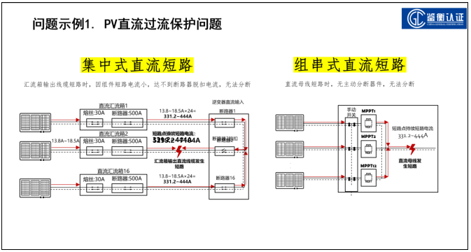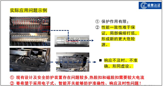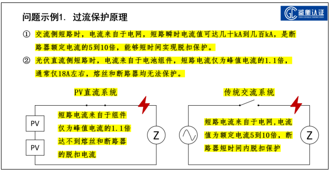 北京鉴衡认证中心副主任纪振双多次在公开场合强调:“交流侧保护当前已经十分成熟, 光伏直流侧保护应进一步加强”。交流侧短路时,短路电流来源于电网,短路电流高达几十kA,断路器能够可靠的分断保护。但是,光伏直流侧短路电流来自于组件,仅为组件峰值电流的1.1倍。