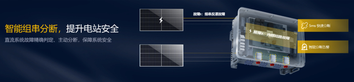 可见,主流逆变器企业已经在技术上实现了“主动安全”,据华为相关负责人介绍,智能组串分断,通过高精度直流传感器,精确检测每路组串电流信号,当检测到故障时,能够主动控制直流分断开关,在5ms内脱扣保护和主动告警,能够实现组串反灌保护与逆变器内部故障保护,有效提升光伏直流系统安全。